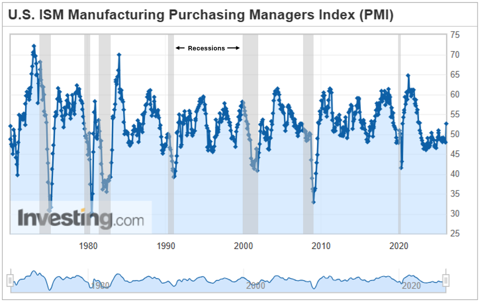 PMI has been at or below 50 for the past 9 months. When this index is below 50, the manufacturing sectors is generally considered to be contracting. However, this week the index jumped from 47.9 to 52.6. We haven't seen a one-month move that strong since 2021. Since the ISM Manufacturing PMI began, we have never seen a recession begin when the Index was making fresh 3-year highs while economic growth was north of 3%.